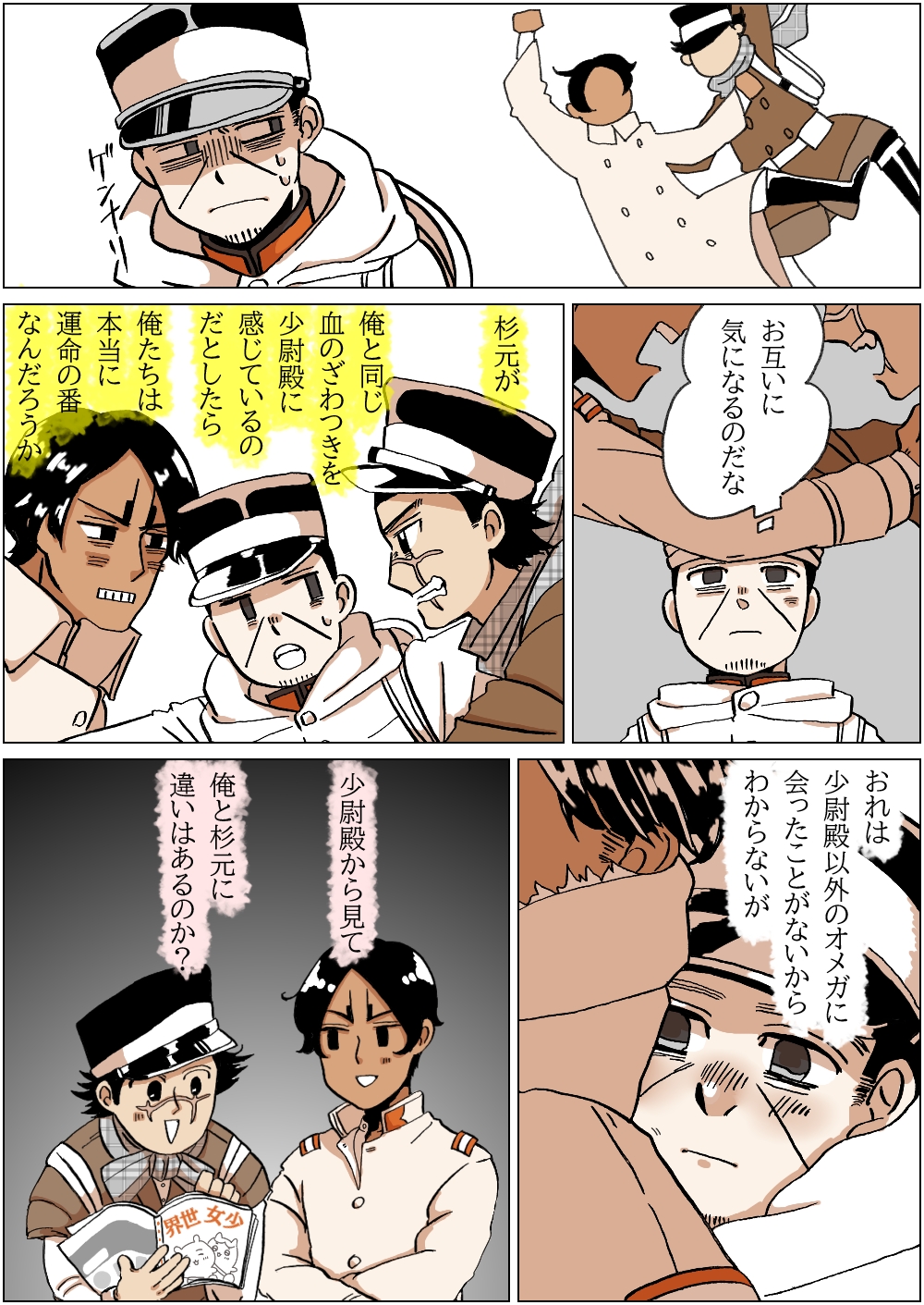 ところで↑の漫画、杉元αと鯉登Ωですが、杉鯉ではないです。 杉元はアシリパさん一筋だし、わたしこの2人って、恋愛感情ないほうが好き。(なんのこっちゃ)