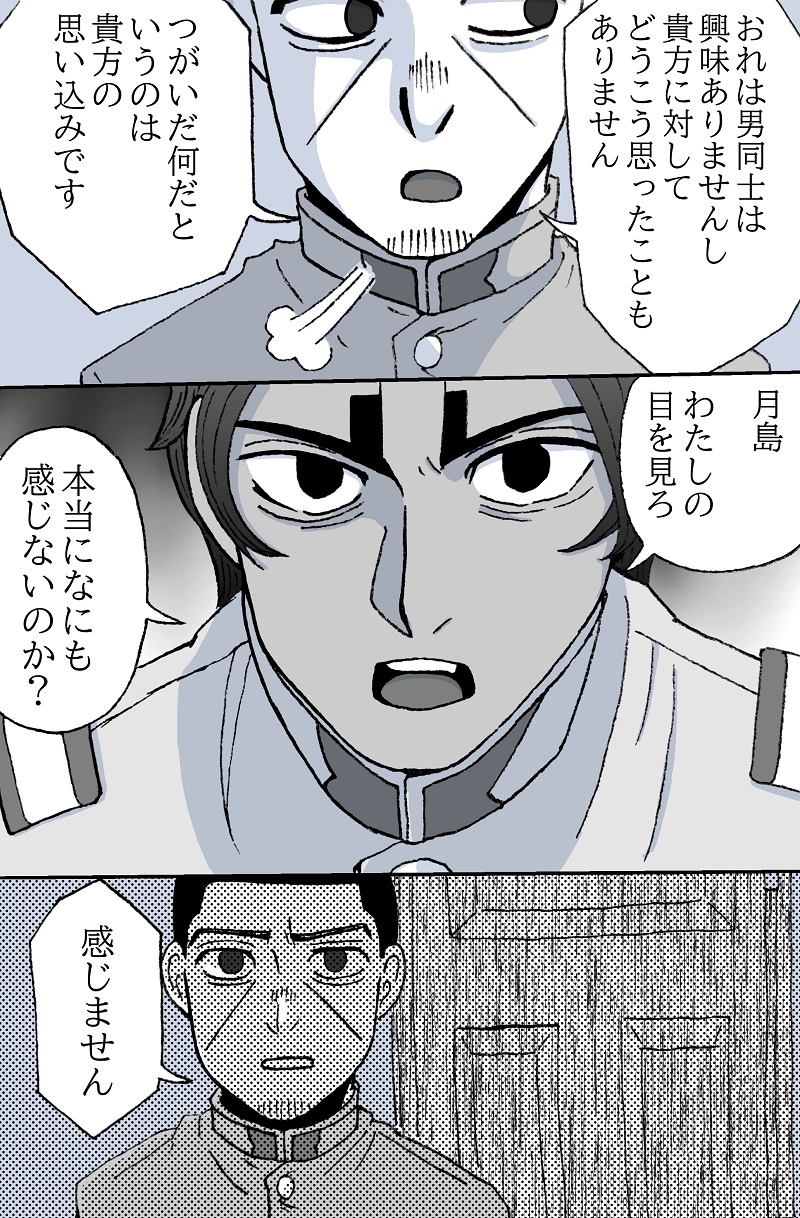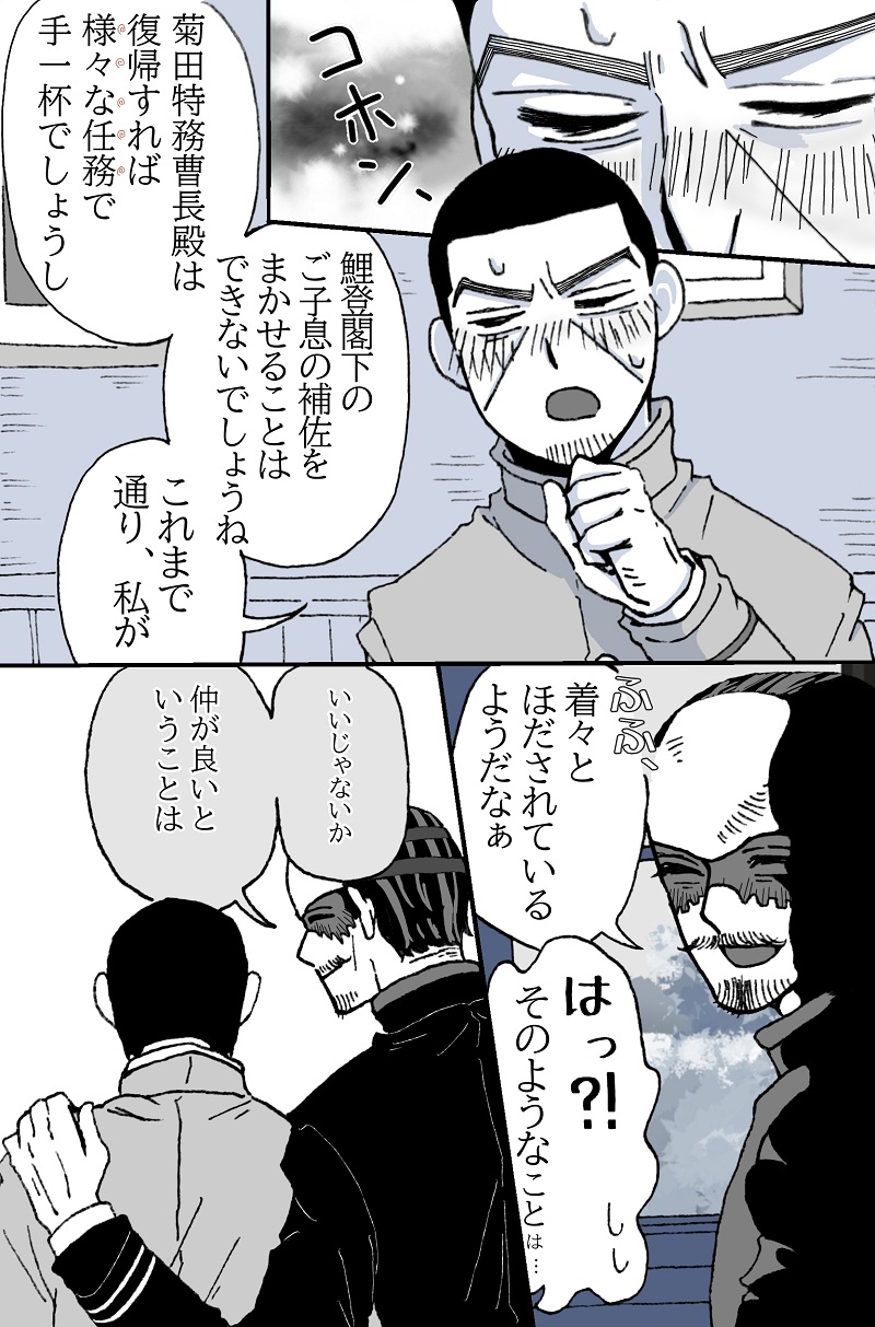 モスとセットで、満州(に行くんだよね?最終的に? アホすぎてあの辺の話がイマイチわからない。 金塊→軍事工場→第七師団の地位向上=こっちのルートはウソ、鯉ちゃんが聞かされてた話 軍事工場→クーデター→満州→でも本当のところは分かりません、あの人は~…=月島しっかりしろよ!ww なんでそんな捨て鉢なんだよ右腕だろ?!中尉殿に賭けてるんだろ?!)まで連れて行くつもりだったのか?